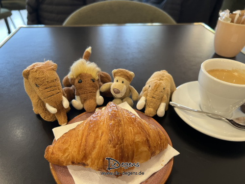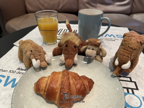 Während die anderen Plüschis noch geschlafen haben, sind wir am Samstagmorgen schon zu einem ersten Spaziergang am Main aufgebrochen. In Frankfurt liegt das Geld sprichwörtlich auf der Straße – wir haben 20 Cent gefunden. Nach neun Uhr sind wir zurück ins Hotel. Da waren dann auch die anderen alle wach und beim Frühstücken. Für uns war es genau die richtige Zeit für ein zweites Frühstück.