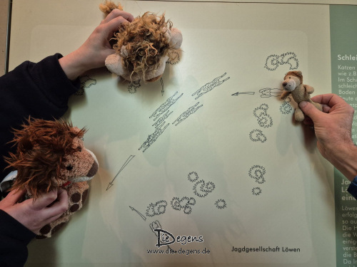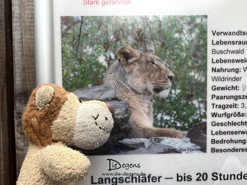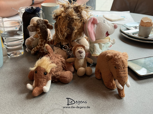 Für den Tag war ein Besuch im Zoo geplant. Am Anfang sind wir noch alle zusammen gelaufen, aber bei den Löwen hat sich die Gruppe immer mehr verteilt. Außer mir waren noch mehr Löwen beim Treffen dabei. Da bot es sich an, ein temporäres Rudel zu bilden. Bei unseren Artgenossen haben wir natürlich mehr Zeit gebraucht. Wir haben auch ganz genau die Jagdstrategien von Löwen studiert. Da das ganz schön hungrig gemacht hat, gab es für uns Würste und am Nachmittag Waffeln. Bei der Fütterung der Pinguine haben wir uns dann alle wieder zusammengefunden. Verständlich, denn beim Plüschitreffen waren Pinguine auch sehr zahlreich vertreten.