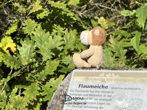 Der Wanderweg ging am Ende des Dorfs gleich steil hinauf zu einem Aussichtspunkt. Leider waren auch heute die Alpen wieder einmal in den Wolken versteckt. Wir sind dann durch einen Wald mit Flaumeichen gewandert. Die Flaumeiche ist eine typische Eiche aus Südeuropa und wächst nördlich der Alpen nur in ein paar Kleinklimazonen. In diesen Gebieten wachsen auch besondere Blumen, aber Anfang Oktober blühten sie natürlich nicht mehr.