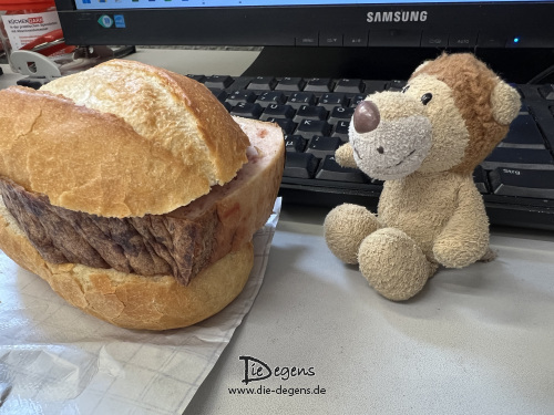 Mittags gab es wie immer Verpflegung. Am ersten Tag durfte ich mir bei meinem Lieblingsmetzger ein Fleischkäsebrötchen holen. Weil ich so ausgehungert aussah, habe ich eine extra dicke Scheibe Fleischkäse bekommen.