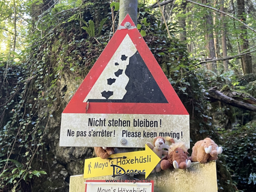 Von Himmelried sind wir durch die Schlucht hinab nach Grellingen. Einen Teil der Schlucht kannte ich schon. Bei einer früheren Wanderung in der Nähe sind wir ein Stück durch die märchenhafte Schlucht gegangen. Am Ende der Schlucht steht ein Schild „Nicht stehen bleiben!“ Wir haben uns daran gehalten und sind direkt zu Maya‘s Häxehüsli weitergegangen. Das ist ein gemütliches Beizli –auf Hochdeutsch: Gaststätte/Wirtshaus- mitten in Wald. Es ist nur eine kleine Hütte und hat nur im Sommer geöffnet. Weil wir nicht zu spät wieder zu Hause sein wollten, haben wir nur ein Eis gegessen und sind zügig weiter.