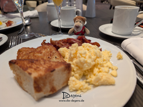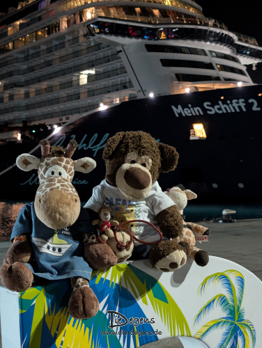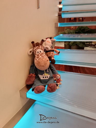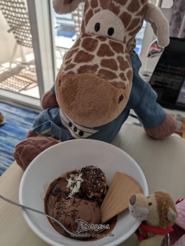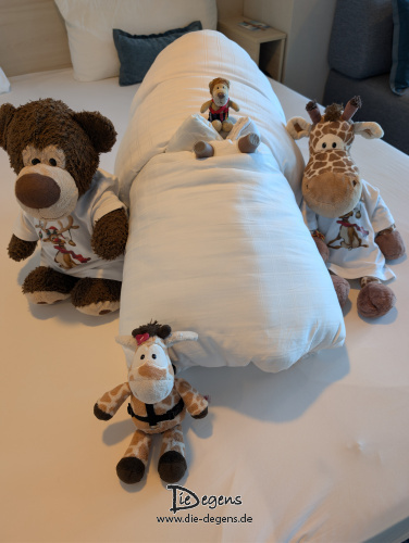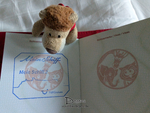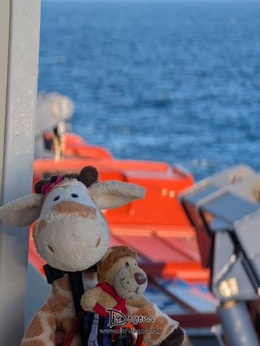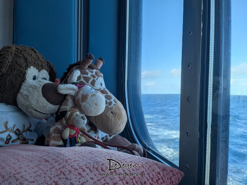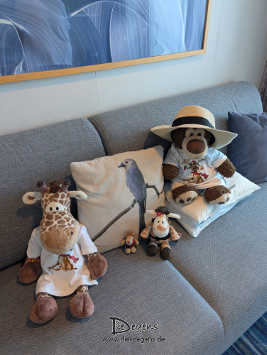 Erst auf dem Schiff bin ich wieder aus dem Handgepäck raus. Und die Menschen waren schon im Stress: Schnell einen ersten Cocktail an der Bar, ein Abendessen am Buffet, eine schnelle Schiffserkundung. Und ich? Mich haben sie mit den anderen Plüschies auf der Kabine gelassen. Unverschämt!