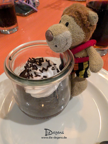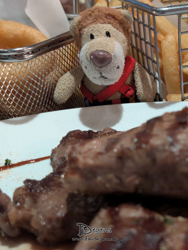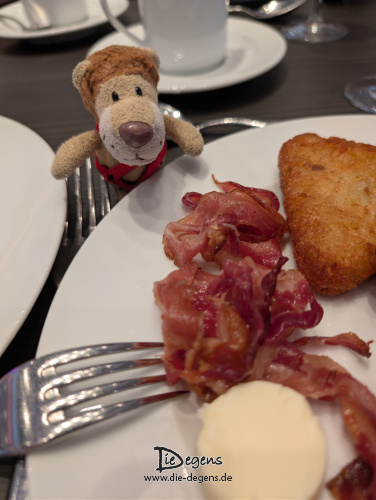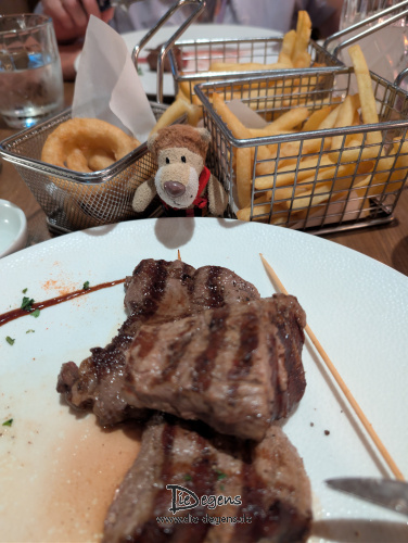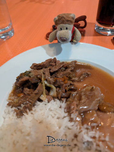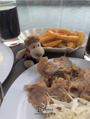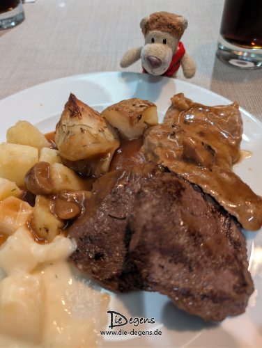 Mein persönliches Highlight des Tages war aber abends an Bord. Ich durfte mit den Menschen ins Steakhaus zum Abendessen. Es gab verschiedene Sorten Fleisch, darunter auch Bison. Das war sehr lecker.