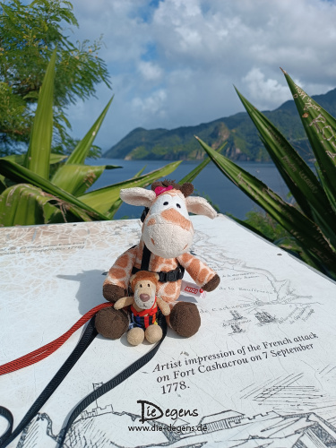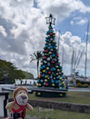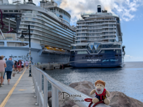 Das Schiff war über Nacht im Hafen geblieben, und so wachten wir wieder im Hafen von Roseau auf. Leider musste sich die Menschin an diesem Tag krankmelden. Ihr ging es nicht gut und so zog sie es vor, trotz eines gebuchten Ausflugs und trotz großen Ehrentages der beiden Menschen, auf der Kabine und im Bett zu bleiben. Also bi ´n ich mit meinem Tourmanager alleine losgezogen.