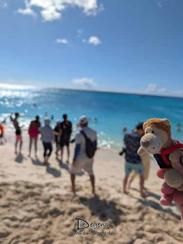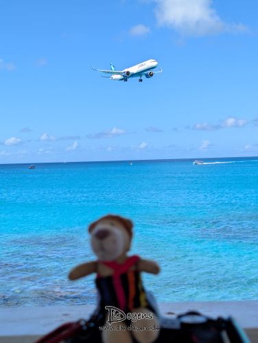 Auch am nächsten Tag, auf Sint Maarten, mussten der Tourmanager und ich wieder alleine los, da die Menschin weiterhin krank war. Wir sind zum bekannten Maho Beach gefahren, wo die Flugzeuge bei ihrer Landung auf dem Flughafen der Insel ganz knapp über den Strand hinwegfliegen. Das war schon spaßig und beeindruckend. Wir saßen einige Zeit mit Cocktails und Snacks in der Strandbar und haben uns die landenden Flugzeuge angeschaut. Und am Strand selbst war echt die Hölle los – so viele Menschen.