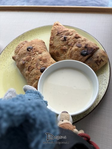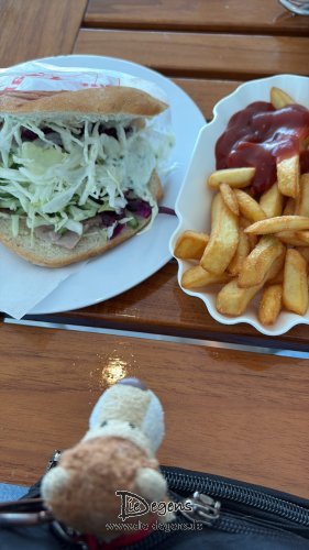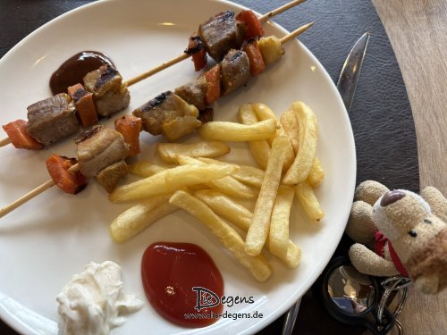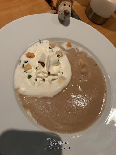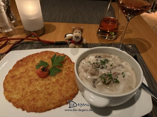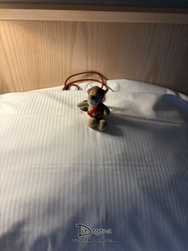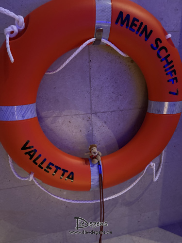 Wir sind am Vortag des Kreuzfahrtbeginns bereits nach München gefahren und haben m Flughafen in einem Hotel eingecheckt. Abends gab es im Restaurant noch ein leckeres Essen – mir wurde eine Suppe, Züricher Geschnetzeltes mit Rösti und ein Dessert serviert – und für die Reise wurde ich mit einem Air Tag gesichert. Ich vermute, dass war eine Auflage von der Reederei, damit ich mich nicht unbemerkt in den Küchen und Fleischlagern des Schiffes aufhalten kann. Diese Vermutung wurde mir aber von niemandem bestätigt.